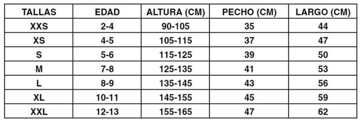 | Talla | XXS NIÑO, XS NIÑO, S NIÑO, M NIÑO, L NIÑO, XL NIÑO, XXL NIÑO |